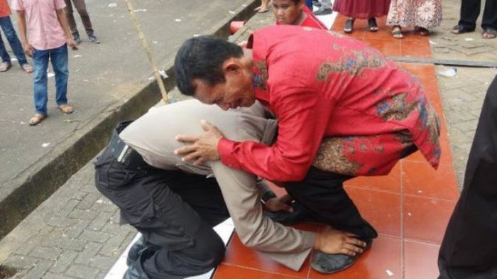 WARTA KOTA, JAKARTA - Bripda Asrul (20) langsung mencium kedua kaki ayahnya, Syamsuar (45) usai resmi jadi polisi, Selasa (6/2/2018).