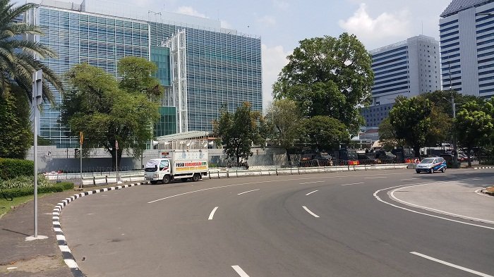 Selain kawat berduri tampak dipasangi pada median jalan, personil brimob bersenjata lengkap serta barracuda disiagakan di depan Kedubes AS.