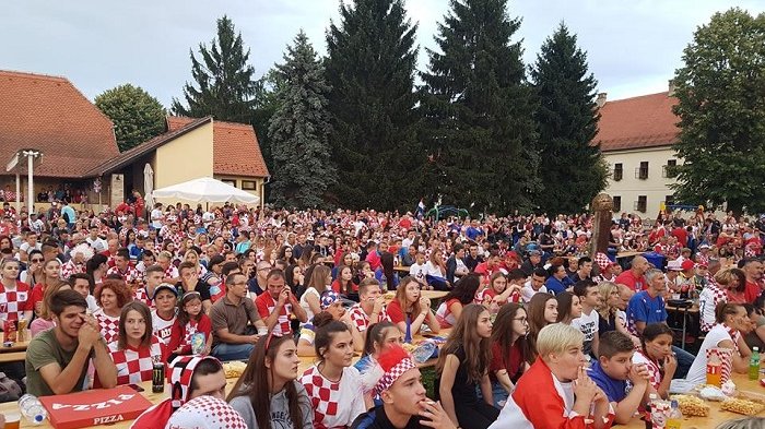 RATUSAN orang warga kota Slavonski Brod, menyaksikan pertandingan Rusia kontra Kroasia di perempat final Piala Dunia 2018, Minggu (8/7/2018) pukul 01.00 WIB, sambil menenggak bir secara gratis.