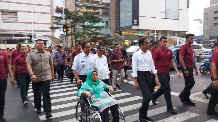 Saat peninjauan jalur pedestrian di Jalan Sudirman, Jokowi yang ditemani Menteri PUPR Basuki Hadimuljono dan Gubernur DKI Jakarta Anies Baswedan, turut menjajal pelican crossing dari depan Hotel Hyatt ke Hotel Pulman.