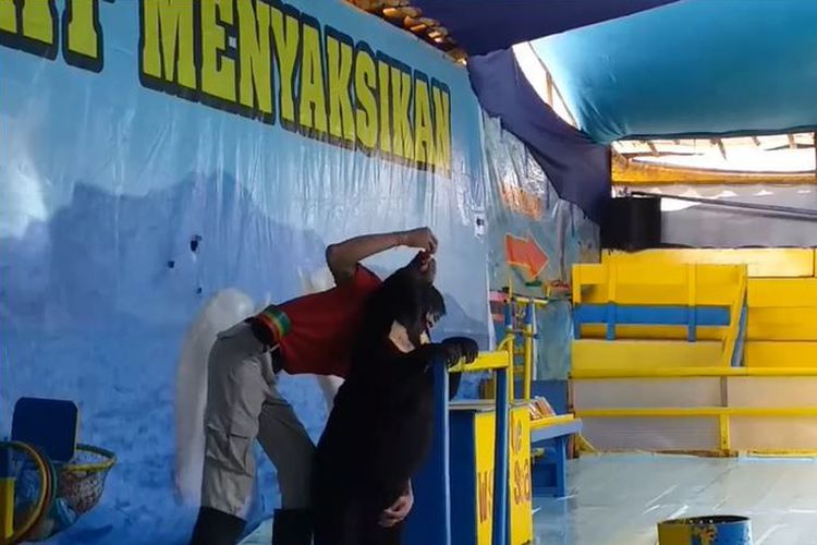 Dalam video itu terlihat seekor beruang yang diketahui bernama Bimo, tengah melakukan atraksi yang diarahkan oleh seorang pelatih.