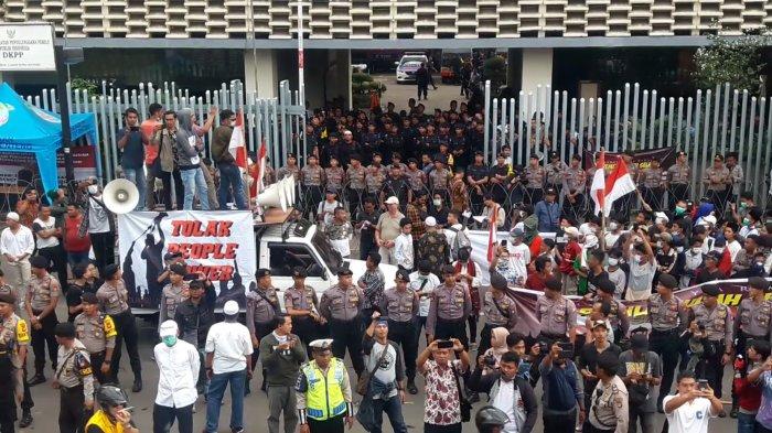 Dua kelompok massa aksi demo di Depan Kantor Bawaslu RI di Jalan MH Thamrin, Jakarta Pusat sempat saling bersitengang hingga membuat insiden kericuhan antar petugas keamanan.