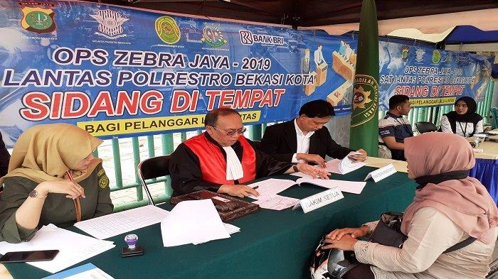 Satuan Lalu Lintas (Satlantas) Polres Metro Bekasi Kota menggelar sidang di tempat bagi para pelanggaran lalu lintas saat pelaksanaan Operasi Zebra 2019 di Jalan Ahmad Yani, Bekasi Selatan, Kota Bekasi, pada Senin (4/11/2019).