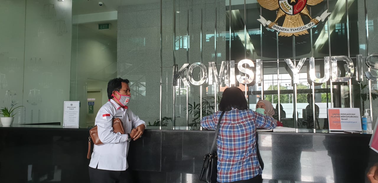 Warga tiba di gedung Komisi Yudisial ditemani oleh kuasa hukumnya, Chrstiawan Budiwibowo, SH dan anggota DPRD DKI Fraksi PSI August Hamonangan.