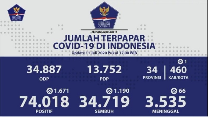 UPDATE Kasus Covid-19 di RI 11 Juli 2020: Total 74.018 Pasien Positif, 34.719 Sembuh, 3.535 Wafat