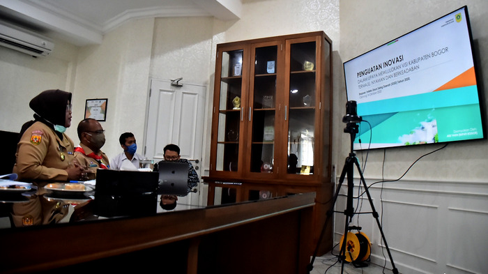 Bupati Ade Yasin secara langsung memaparkan keunggulan Kabupaten Bogor di depan dewan juri dalam presentasi secara virtual dari ruang kerjanya.