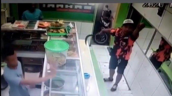 Dalam video terlihat pria berseragam loreng merah itu datang sambil membawa celurit dan mengacungkan ke penjaga warteg.
