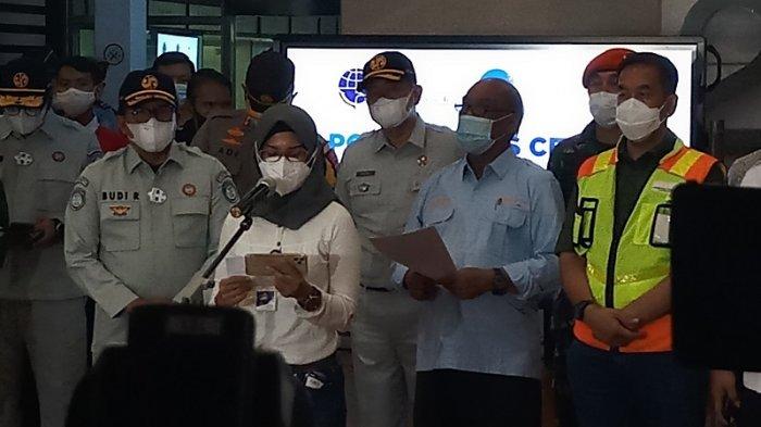 Juru bicara Kementerian Perhubungan Republik Indonesia (Kemenhub RI), Adita Irawati bersama Kepala Basarnas Bagus Puruhito, Ketua KNKT Soerjanto Tjahjono, Dirut AP II Muhammad Awaluddin, Dirut Airnav Indonesia M. Pramintohadi Sukarno, dan Dirut Sriwijaya Air Jefferson Irwin Jauwena menggelar jumpa pers terkait hilang kontak pesawat Sriwijaya Air SJ 182 tujuan Jakarta-Pontianak di terminal 2D Bandara Soekarno-Hatta, Tangerang, Sabtu (9/1/2021).