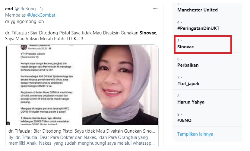 Hal itu bisa terlihat dari trending topic Sinovac pagi ini.