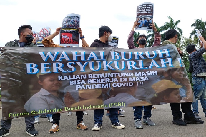 Korlap aksi FSBI Ahmad Nur meminta kepada seluruh buruh tetap bersyukur masih bisa bekerja dalam situasi pandemi ini, meski kenaikan upah nantinya hanya satu persen.