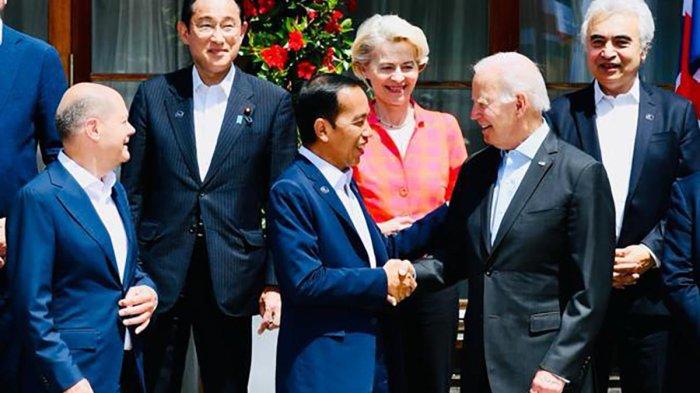Presiden Jokowi melakukan sesi foto bersama. Tampak Kepala Negara berdiri di antara Kanselir Jerman Olaf Scholz dan Presiden Amerika Serikat Joe Biden. Dalam sesi foto ini tampak keakraban yang dilakukan oleh Presiden Amerika Serikat Joe Biden.