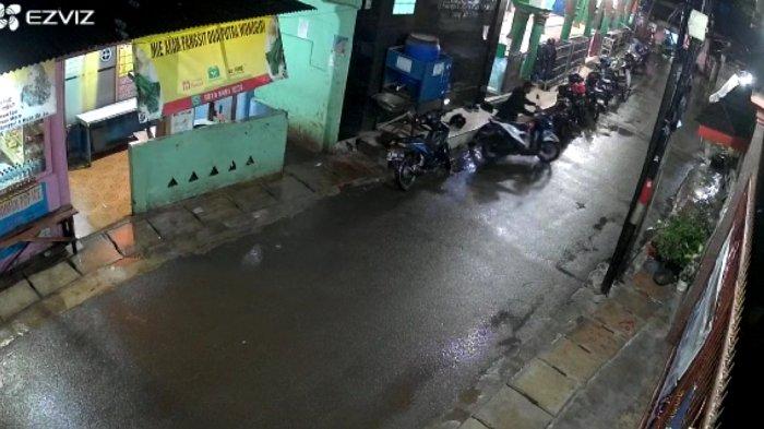 Dalam rekaman CCTV tersebut memperlihatkan, satu pelaku yang beraksi, nampak mendorong kendaraan sepeda motor berwarna biru hasil curian, yang terparkir persis di depan Masjid Assalam