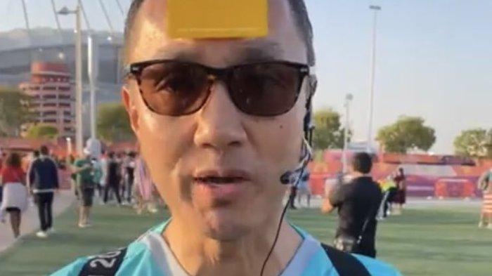 Geo Otsu, yang terlihat mengenakan pakaian unik berupa kostum wasit Piala Dunia 2022, lengkap dengan patch, kartu kuning dan merah