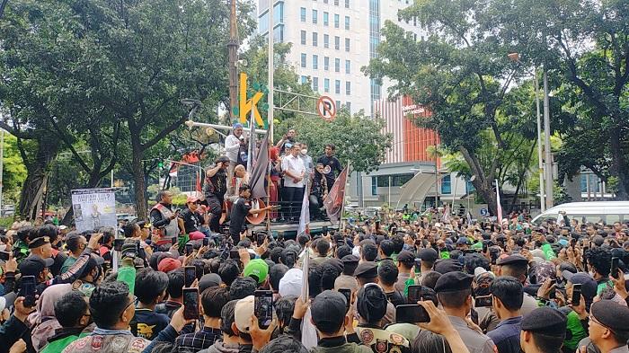 Pernyataan sikap Ismail disambut tepuk tangan dan teriakan bangga dari ratusan massa aksi tersebut.