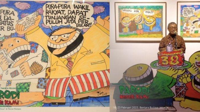 Ada pameran tunggal "Parodi Negeri Kami: 38 Tahun Kartun Timun karya Rahmat Riyadi (LIBRA) di Bentara Budaya Jakarta yang dibuka pada Kamis (16/2/2023).