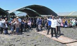 Akibatnya, warga yang hadir pun terlihat sulit berjalan lantaran kaki mereka masuk ke dalam lumpur yang tebal.