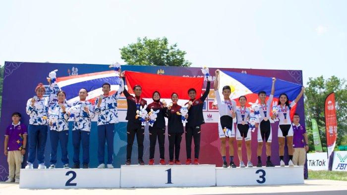 Timnas balap sepeda Indonesia berhasil meraih medali emas ketiga di SEA Games 2023 Kamboja dari nomor Mixed MTB Cross Country Relay, Minggu (7/5/2023)
