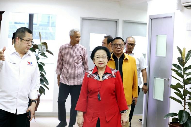 Saat tiba di Gedung High End, Presiden Kelima RI ini disambut oleh Ketua Umum Perindo Hary Tanoesoedibjo dan Sekjen PDIP Hasto Kristiyanto.