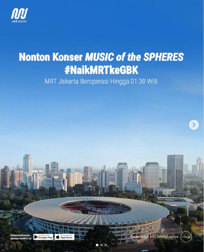 "#PastiBisa nonton konser Music of The Spheres World Tour dengan aman, nyaman, dan tertib naik MRT! Teman MRT, kabar gembira buat kamu para Coldheads yang akan nonton konser Coldplay di Stadion Utama GBK, karena MRT Jakarta akan beroperasi hinggal pukul 01.30 WIB pada 15 November 2023 dan siap antar kamu dengan aman dan nyaman hingga acara selesai," tulis MRT lewat Instagram resminya, @mrtjakarta.
