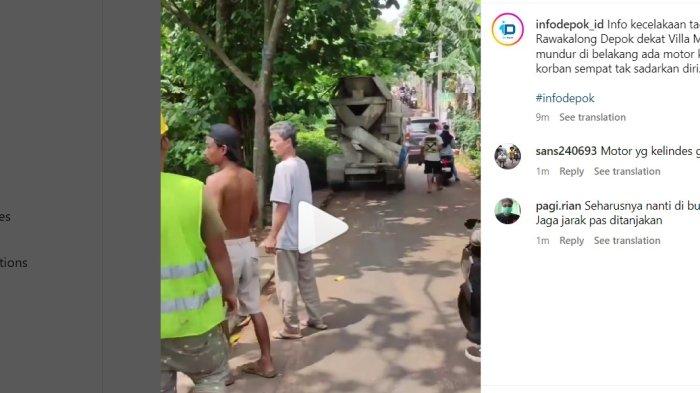 "Info kecelakaan tadi pagi di kawasan Jl. Rawakalong Depok dekat Villa Mutiara Cinere. Truk molen mundur di belakang ada motor kelindes. Saat kecelakaan tadi korban sempat tak sadarkan diri," tulis @infodepok_id.