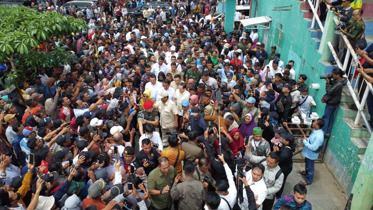 Kehadiran Prabowo disambut meriah masyarakat sekitar, dari emak-emak hingga guru asrama boarding school MTsN Blora di balik pagar lapangan Jeponkrajan