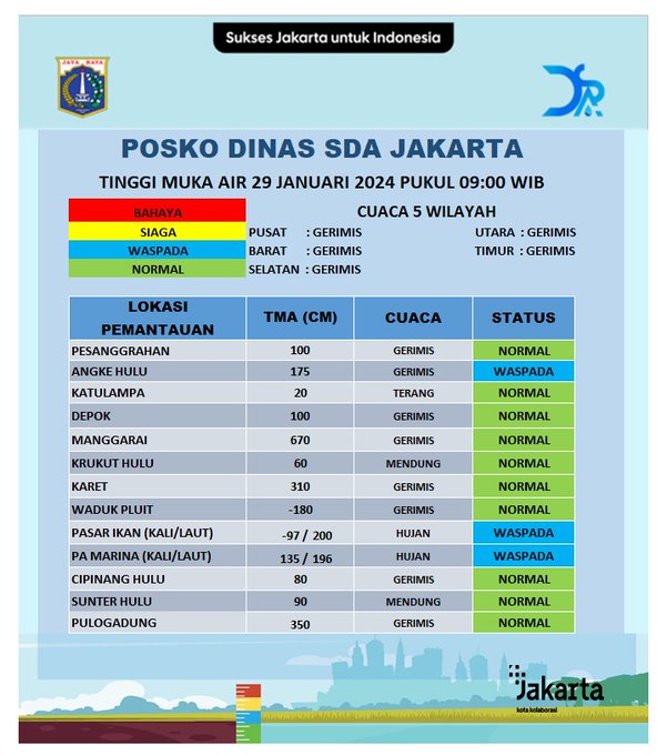 Pintu Air Katulampa, Depok, Manggarai, Karet, dan Krukut Hulu saat ini berstatus siaga 4 atau normal.