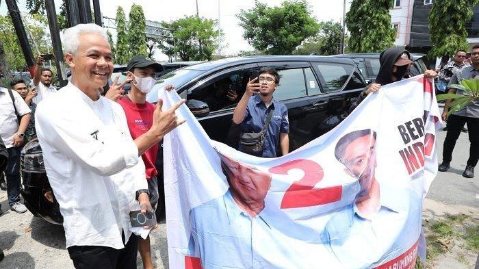 Ganjar diadang pendukung Prabowo-Gibran yang bentangkan spanduk. Bukannya marah, Ganjar justru ajak mereka makan siang bersama