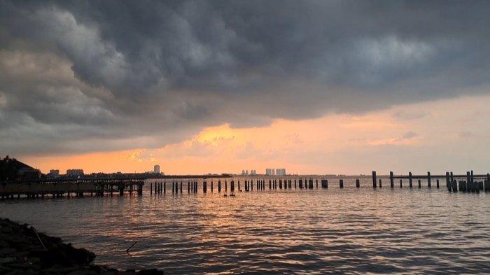 Meski warna jingga matahari itu diselimuti awan hitam pekat, namun sejumlah wisatawan tetap berjajar demi menikmati syahdunya pemandangan Ancol di sore hari.