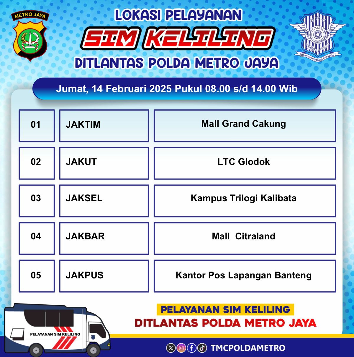 Dikutip dari TMC Polda Metro Jaya, berikut jadwal SIM Keliling Jakarta, Jumat (14/2/2025) :