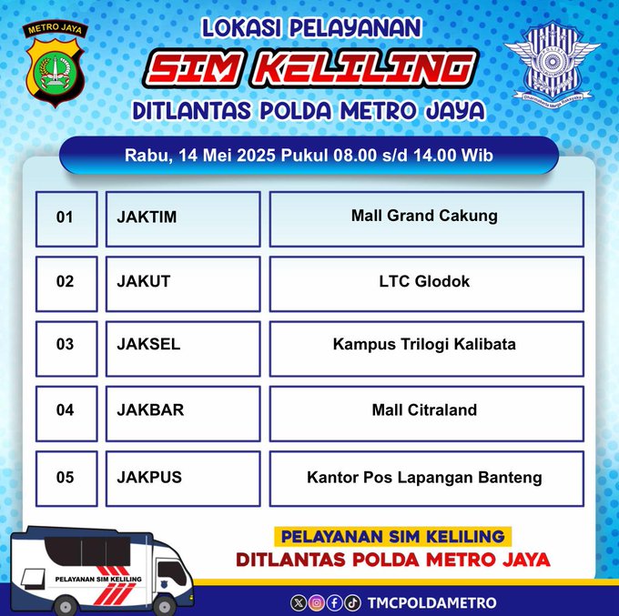 Simak lima lokasi pelayanan SIM Keliling Jakarta hari ini, Rabu (14/5/2025) yang digelar Ditlantas Polda Metro Jaya.