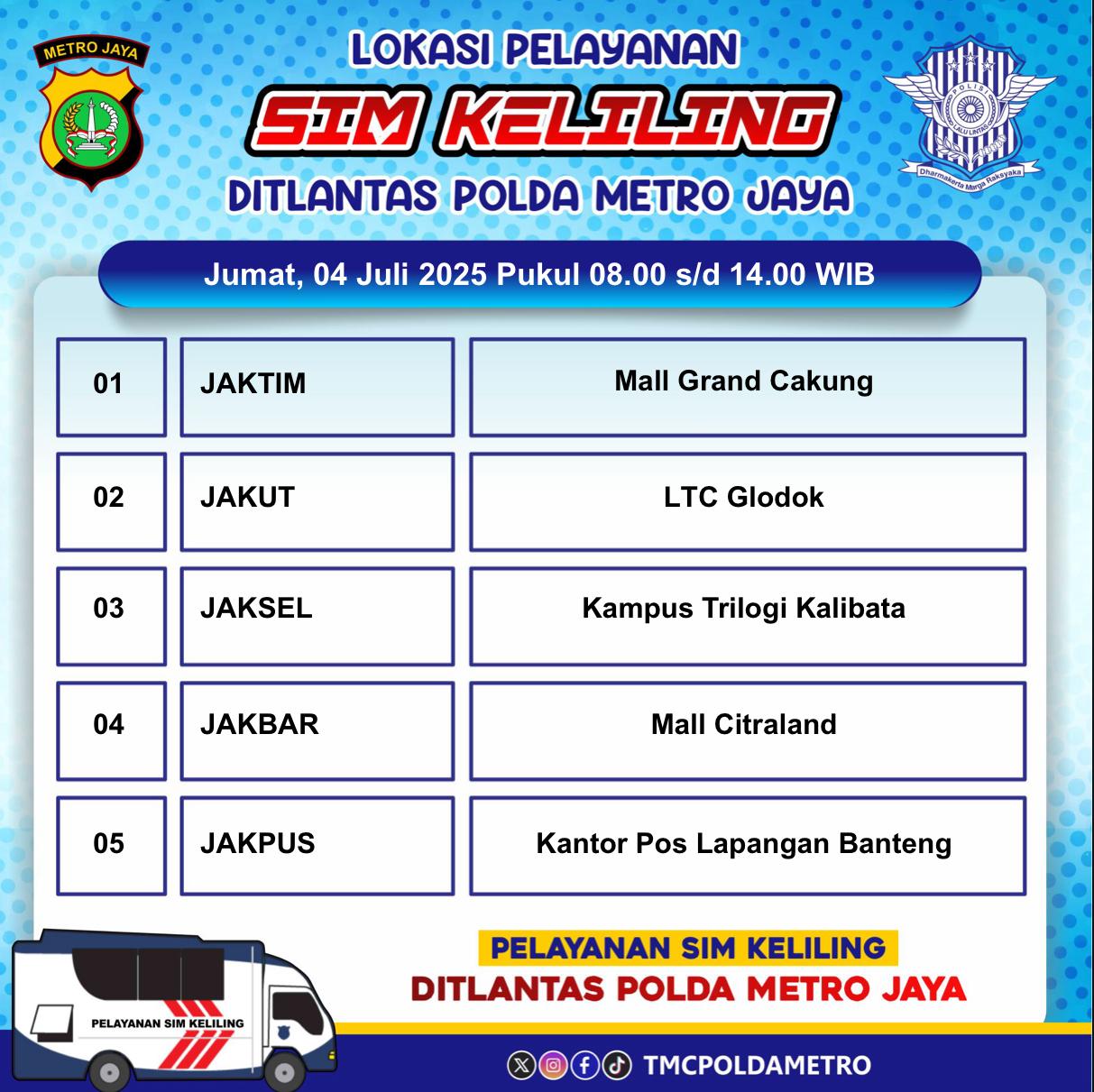 Ada lima lokasi pelayanan SIM Keliling Jakarta hari ini, Jumat (4/7/2025) yang digelar Ditlantas Polda Metro Jaya.