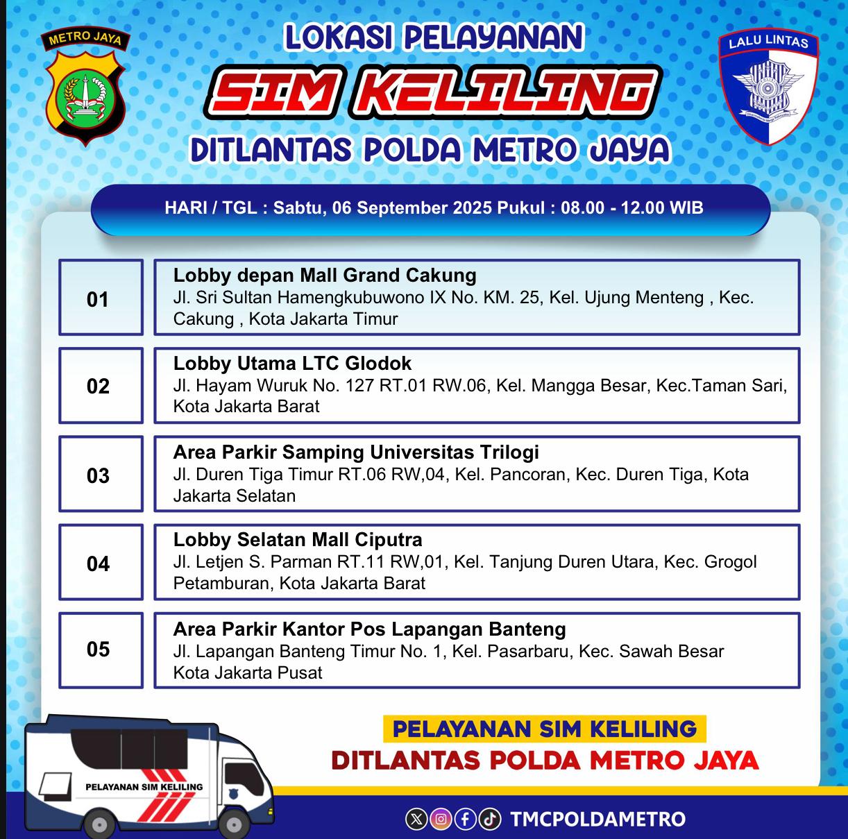 Simak lokasi pelayanan SIM Keliling Jakarta hari ini, Sabtu (6/9/2025) yang digelar Ditlantas Polda Metro Jaya.