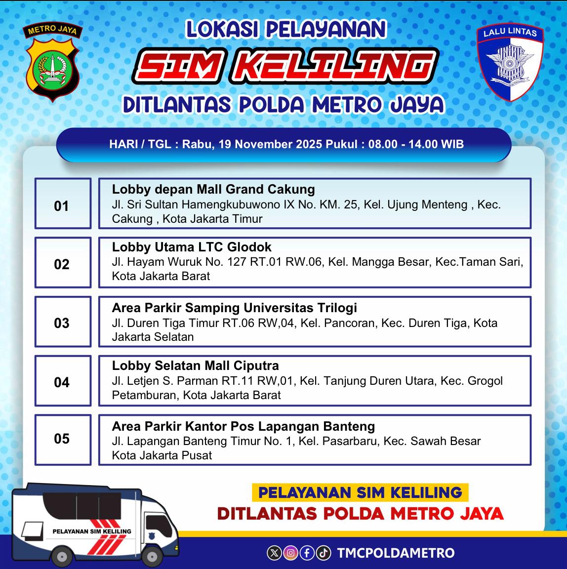 Dikutip dari TMC Polda Metro Jaya, berikut jadwal SIM Keliling Jakarta, Rabu (19/11/2025) :