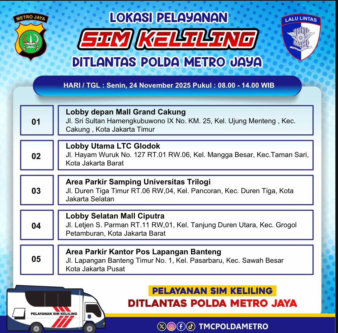 Dikutip dari TMC Polda Metro Jaya, berikut jadwal SIM Keliling Jakarta, Senin (24/11/2025) :
