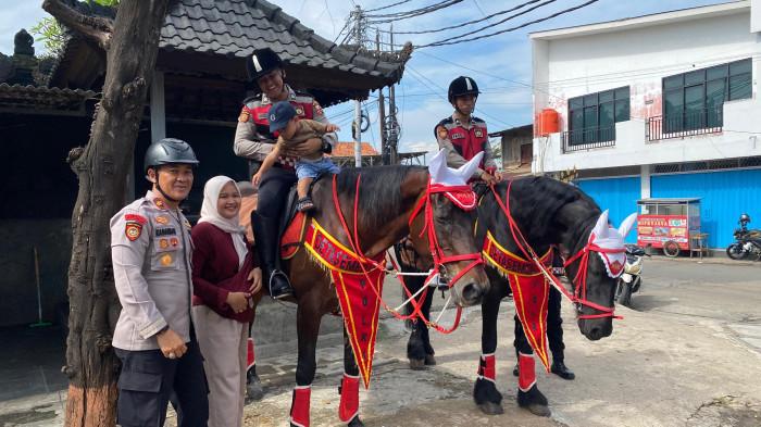 Cara Unik Warga Depok Nikmati Akhir Pekan, Berfoto dengan Pasukan Berkuda Polri. Kehadiran pasukan berkuda Detasemen Turangga, Baharkam Polri