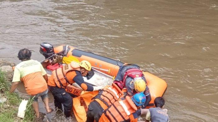 Petugas gabungan menemukan jenazah Rendi Efendi (21), seorang pekerja bangunan yang terseret arus Kali Ciliwung saat sedang bekerja membuat turap
