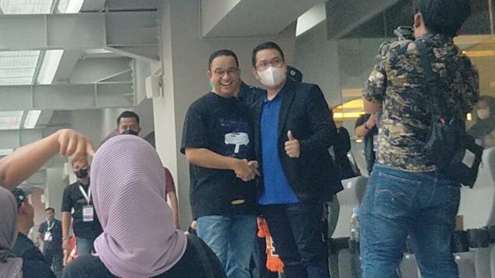 Gubernur DKI Jakarta, Anies Baswedan tampak menyapa beberapa orang yang berada di kursi VVIP Jakarta International Stadium (JIS)