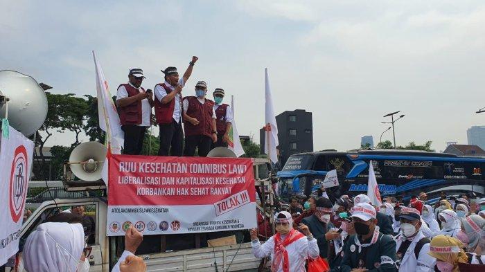 Ribuan tenaga kesehatan berunjuk rasa depan kantor Menko PMK, Kemenko Polhukam dan menuju Istana Negara menuntut pembatalan RUU Omnibus Law kesehatan.