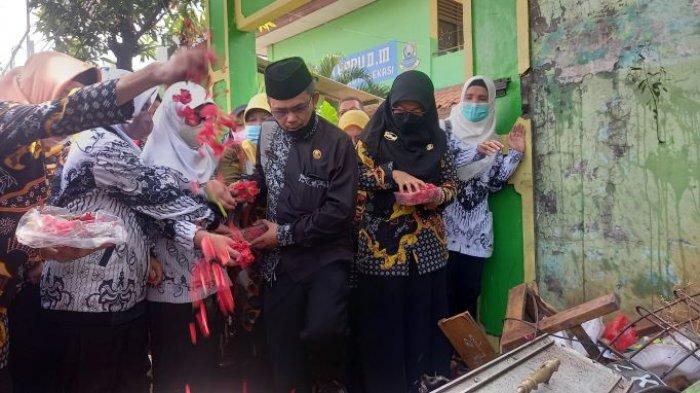 Belasan guru Sekolah Dasar (SD) Negeri II dan III Kota Baru, Kota Bekasi, menangis saat tabur bunga di lokasi kecelakaan maut yang menimpa siswanya