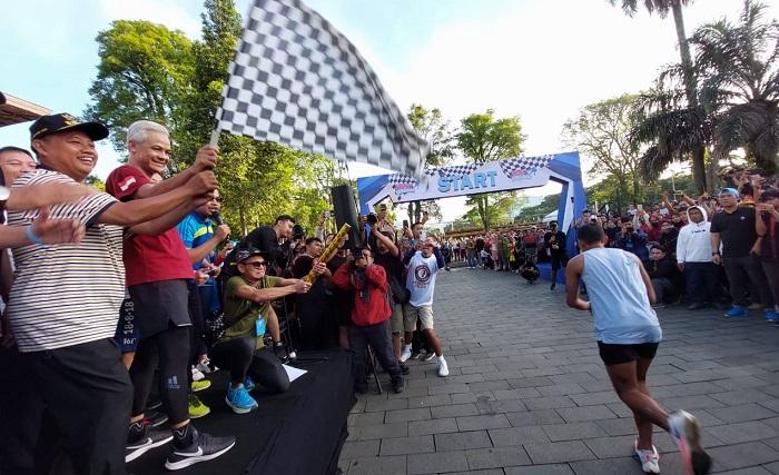 Calon Presiden dari PDI Perjuangan Ganjar Pranowo menghebohkan warga Bandung, Minggu (14/5/2023) pagi.